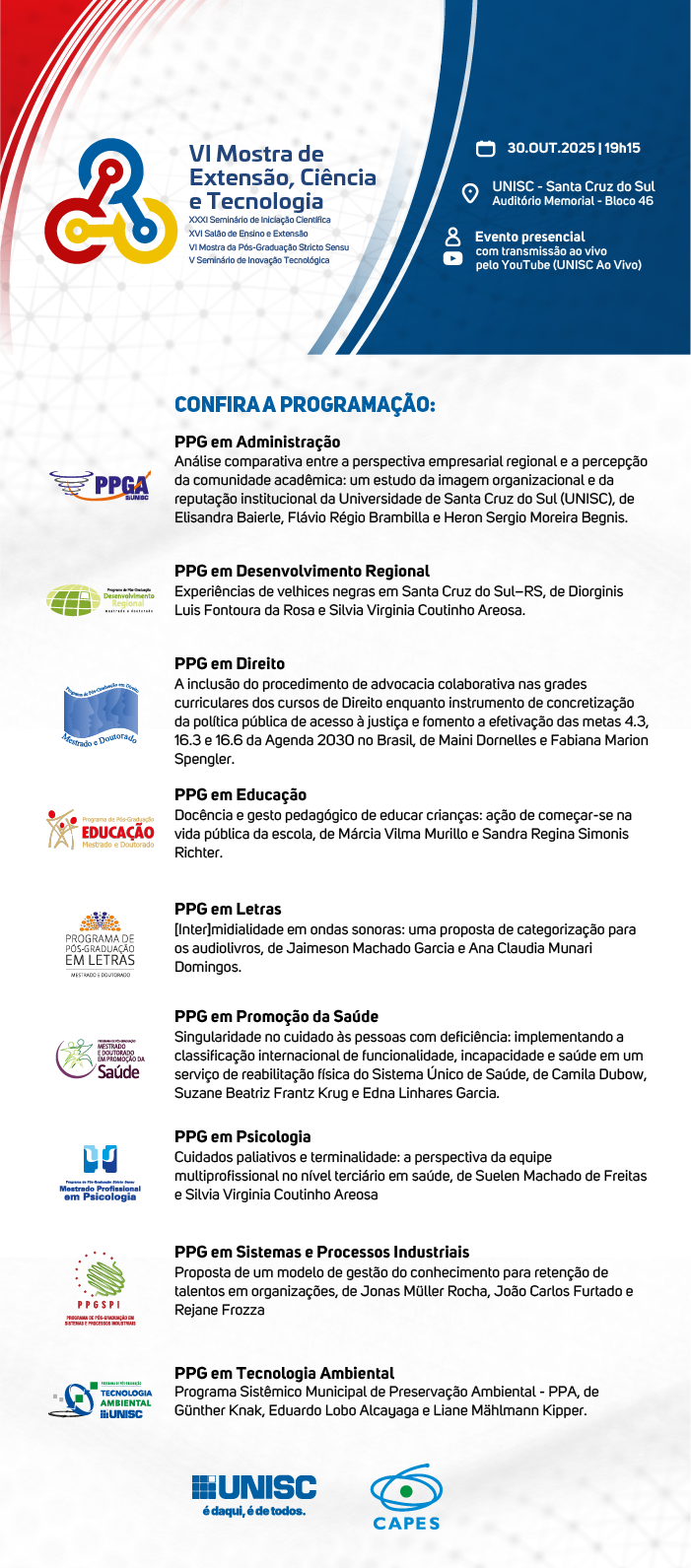 14h - Fortalecimento e impacto das revistas científicas da Unisc 19h15 - VI Mostra da Pós-Graduação Stricto Sensu Mestrados e Doutorados ![]() |