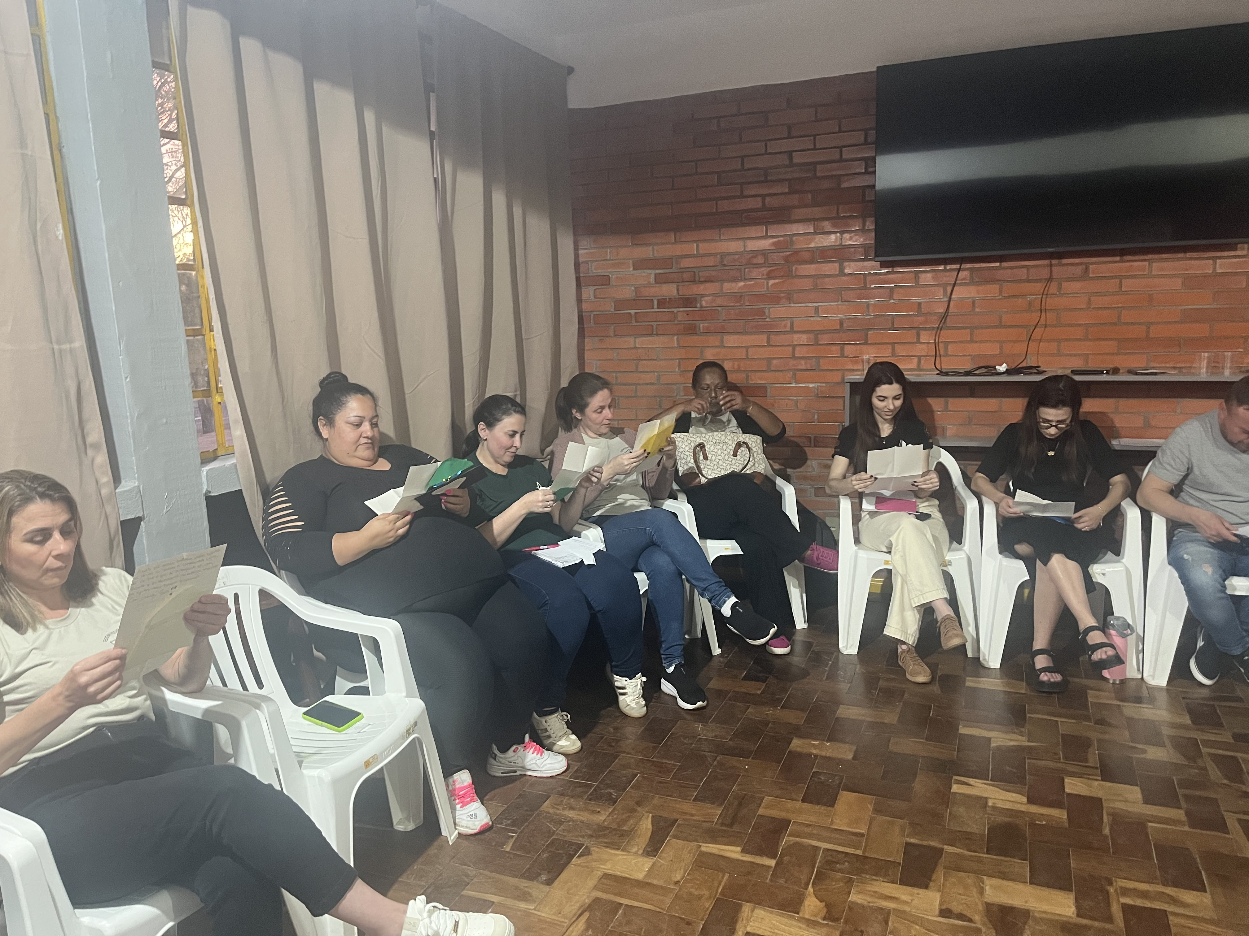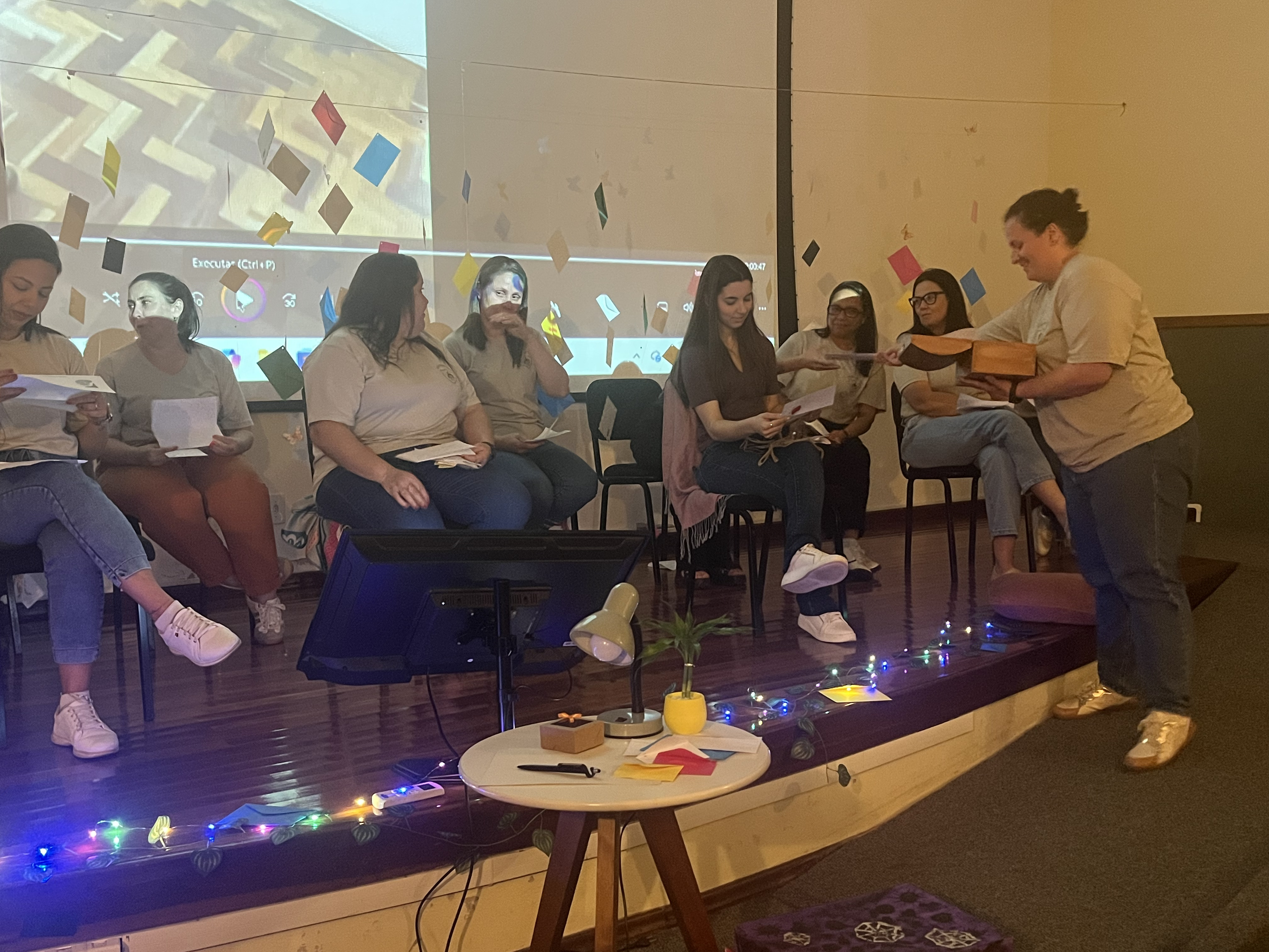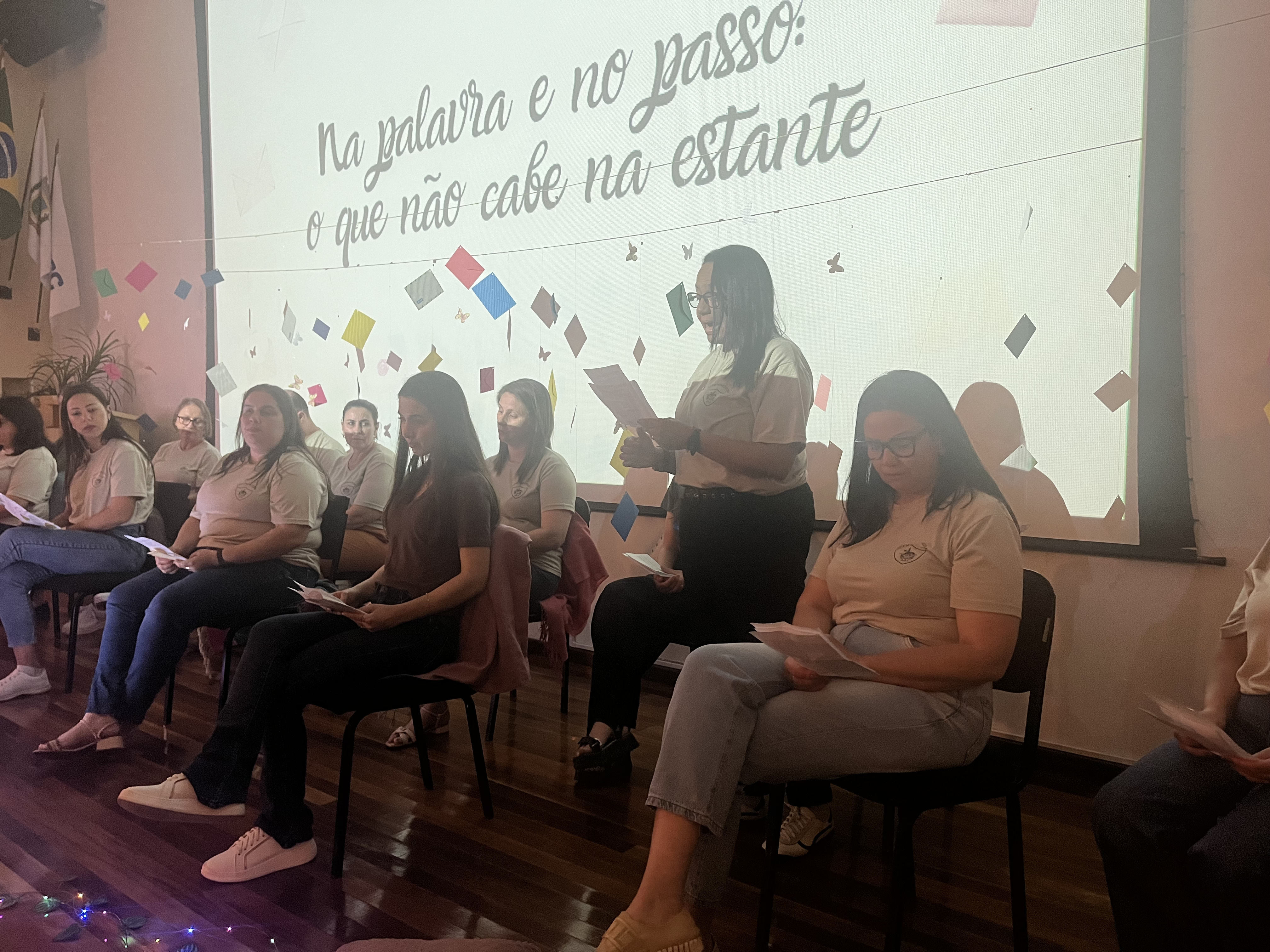 Encontro do grupo com professores e funcionários da escola em virtude da pesquisa-ação da doutoranda e professora Letícia Fregapani